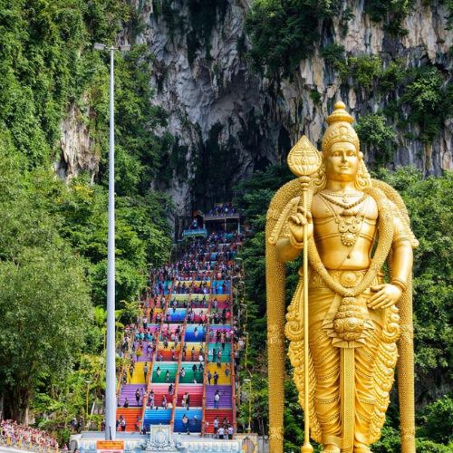 Batu Caves is a famous limestone hill featuring towering caves and Hindu temples near Kuala Lumpur.